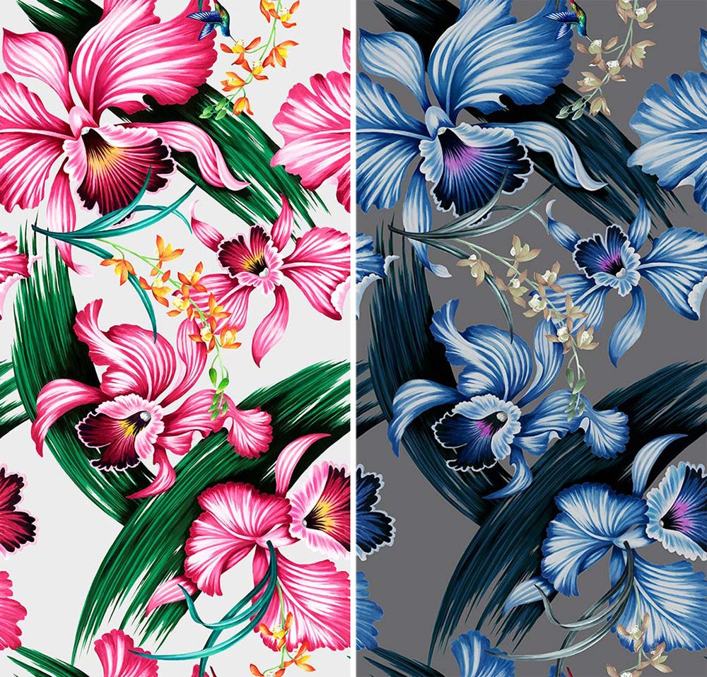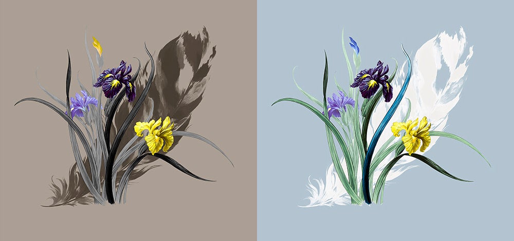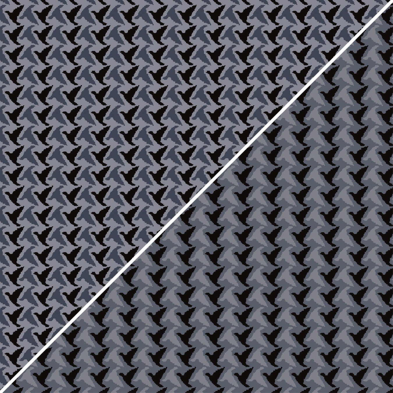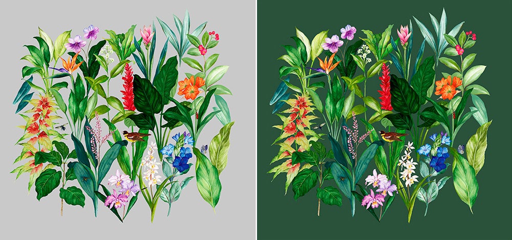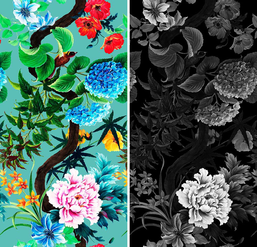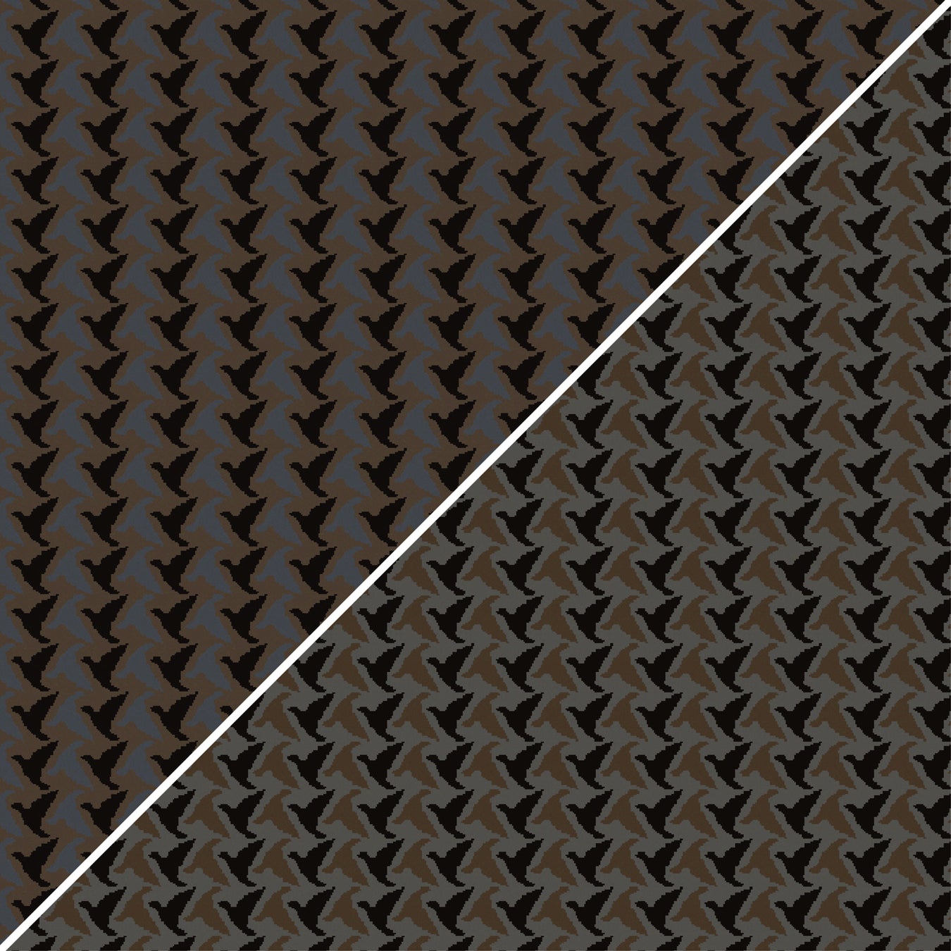 2種類の柄は、実は全く同じ模様。使用する色の組み合わせが異なることで、柄の印象が変化。雄鳥の美しい羽根をイメージした4種のカラーリング。