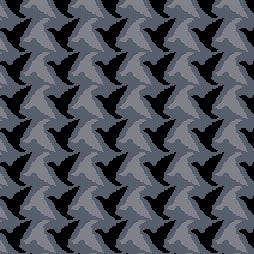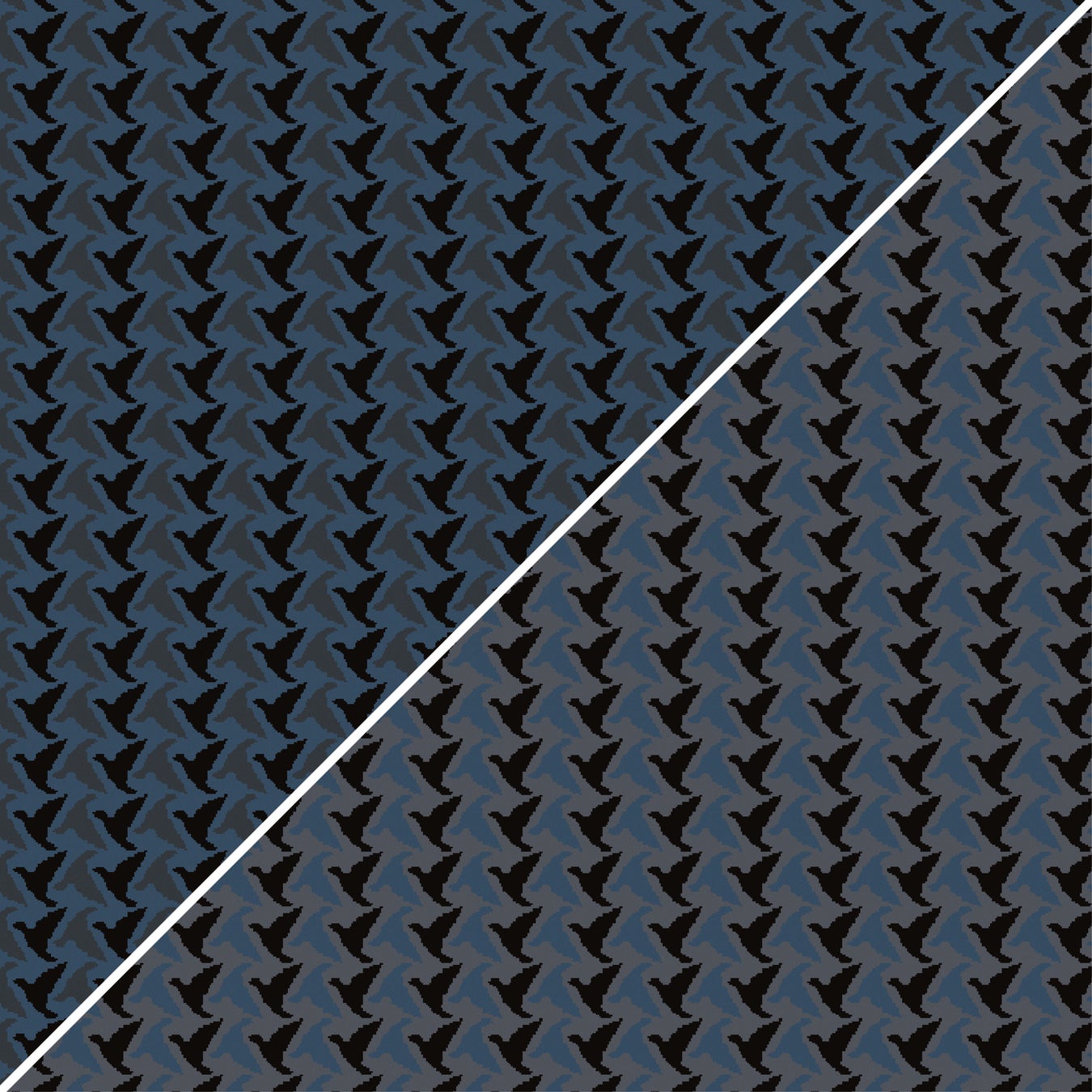 羽ばたく鳥のシルエットが連続するデザイン。職人の手技による地染め(刷毛染め)と、モチーフが成立する限界まで小さく緻密に表現したプリント技術を融合。模様の細密さと配色の妙で、一見すると織物のような印象に。