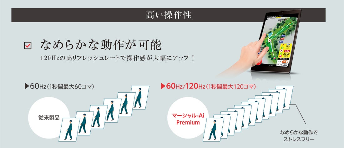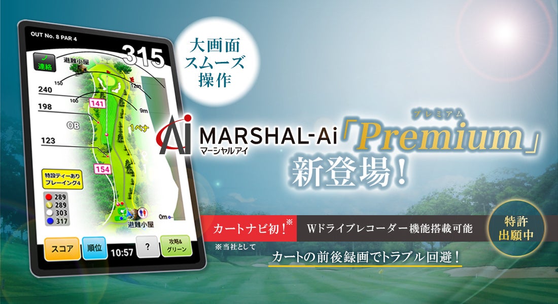 この度、新たに最新型のタブレットを導入し「Marshal Ai Premium」として発売いたします。この新型タブレットでは11.5インチという従来型に比べて画面サイズが約20%程度大きいモデルとなり、解像度も従来型より高いため視認性が高く、カートの後部座席に座るプレーヤーからでも見やすい画面を提供致します。また、高性能なCPUによるなめらかな画面操作が可能となります。