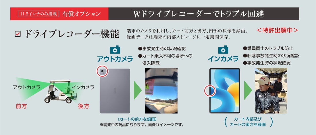 また、当社のカートナビシステムとして初めてとなるドライブレコーダー機能を搭載します。このドライブレコーダーはカートの前方、後方を撮影します。これにより、カート事故時の状況や運転状況を記録することができます。また、後方カメラにより、ゴルフバッグの盗難やキャディへのハラスメント対策としても有効です。