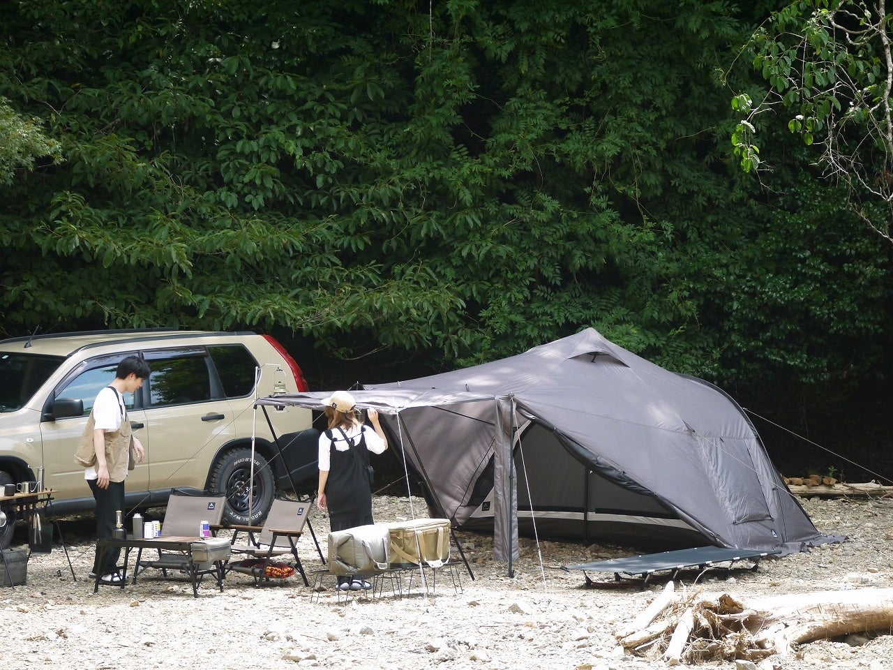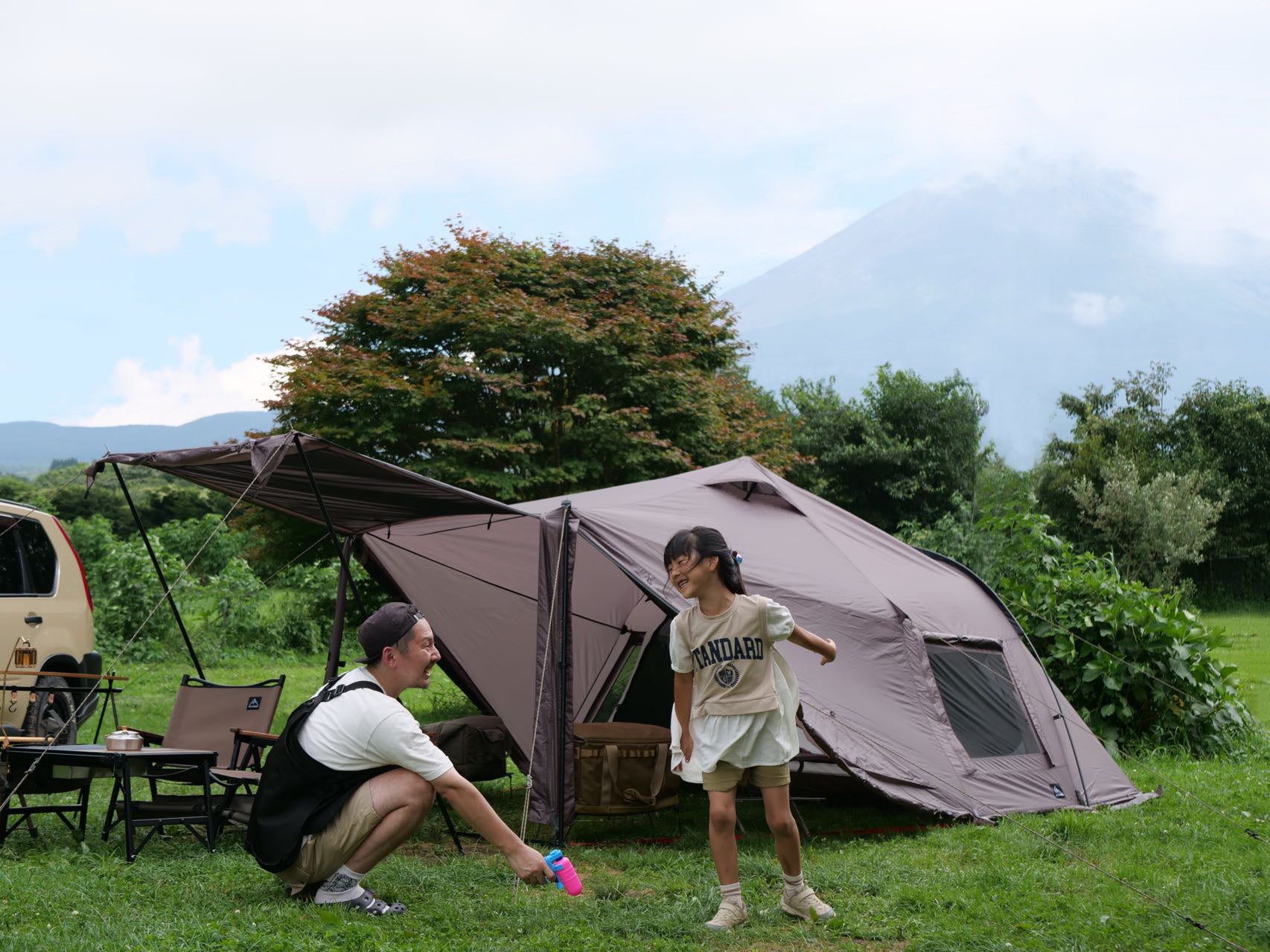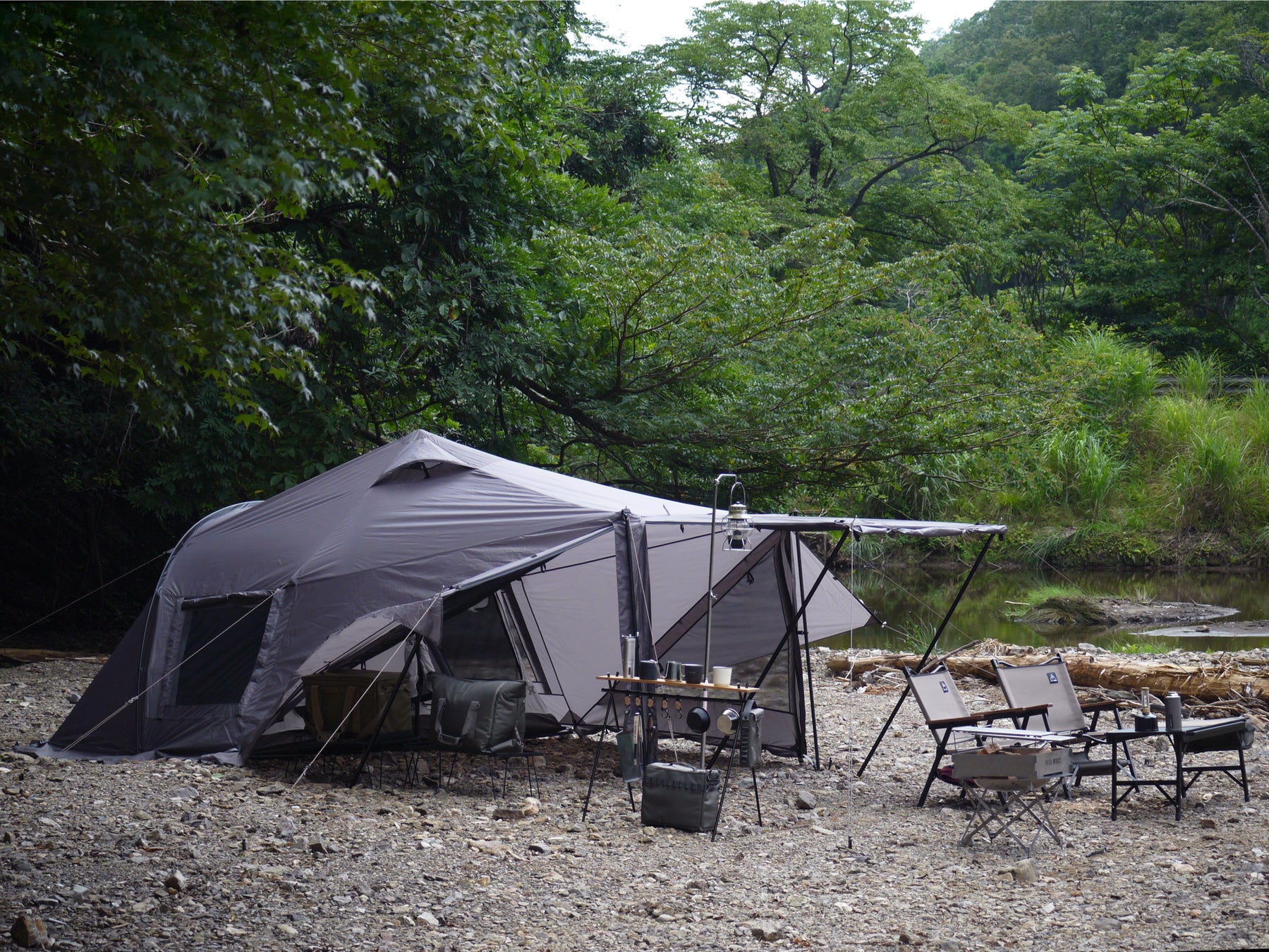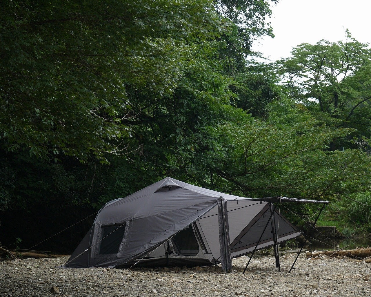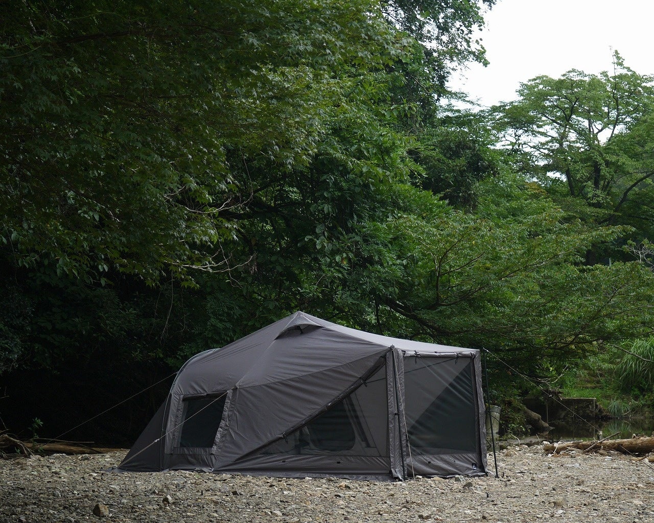 テントの前面と両サイドのドアパネルを跳ね上げると、180度の景色が広がり、自然を存分に感じながら過ごすことが出来ます。サイドのドアパネルが傾斜していることで適度な閉塞感もあり、まるで秘密基地にいるようなプライベート感も魅力的です。スカート付のため、夏は虫の侵入を冬は冷気の侵入を軽減し、巻き上げることも出来るのでフルシーズン使用可能なテントです。
