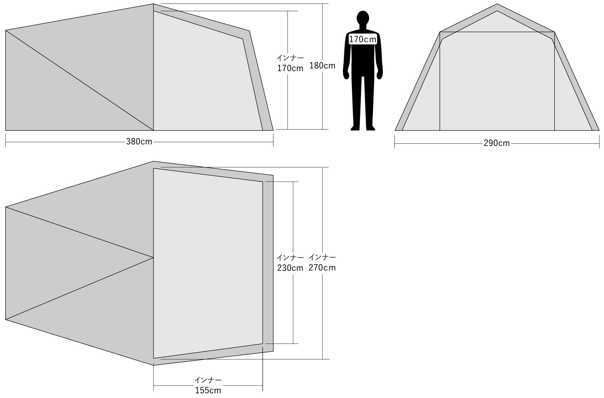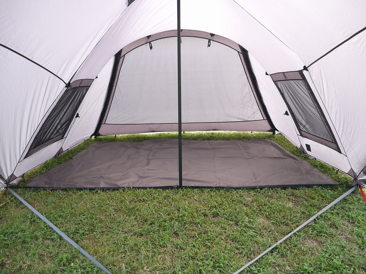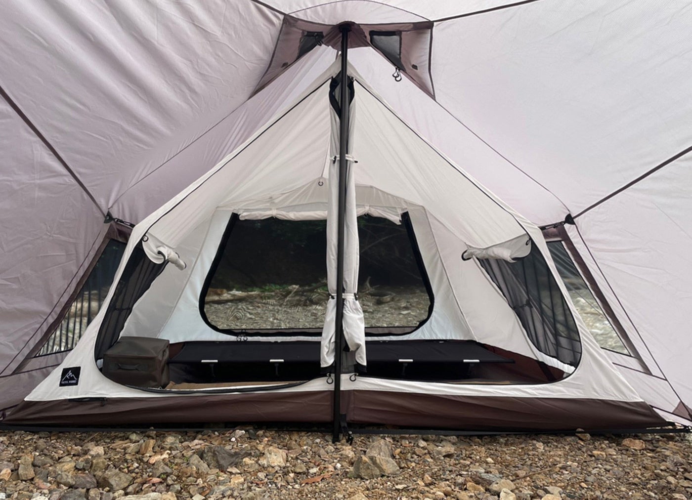 インナーにはTC(ポリコットン)素材を使用しているので風合いが良く、夏は通気性に優れ、冬場は結露を防ぎます。また、テントの最頂部の高さが180cmあるのでインナーテント(間口高170cm)への出入りが非常に楽に感じられます。テント内も前後左右に大きな窓が付いておりますので、夏場でも風を通し快適に過ごすことが出来ます。