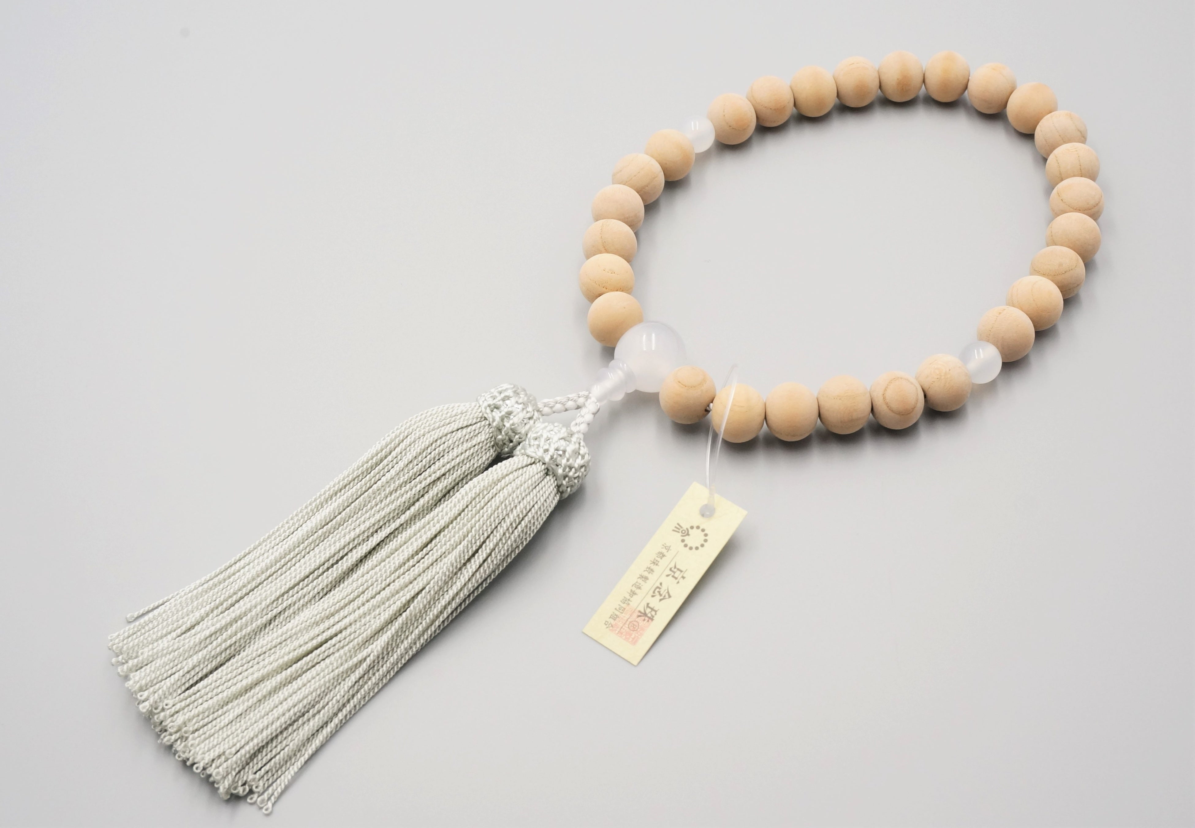 スタートを表す色である白色の瑪瑙をあしらった、新生活を始めるのにふさわしい数珠です。白瑪瑙は恐れや不安を克服して体と心のバランスを保ってくれるといわれています。