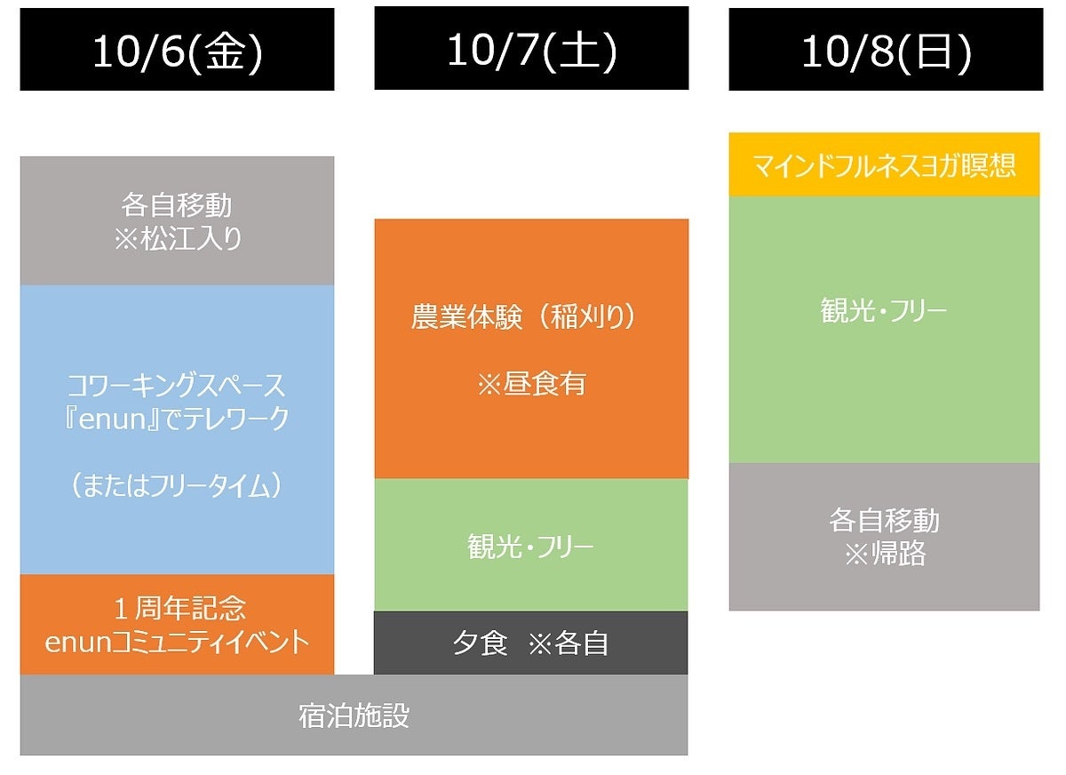 1周年記念enunコミュニティイベント、農業(稲刈り)体験、マインドフルネスヨガ瞑想を含むプランです。