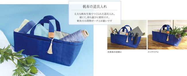 関西で織られ、大阪の加工所で染めと加工・縫製された、丈夫で軽い帆布の道具入れ。持ち運びしやすいバッグ型です。さまざまな使用シーンを想定し、幾度も試作を繰り返しながら、確かな縫製技術を駆使してでき上がりました。使うほどに独特の風合いが増し、しっくり馴染んでくるパラフィン加工を施しています。