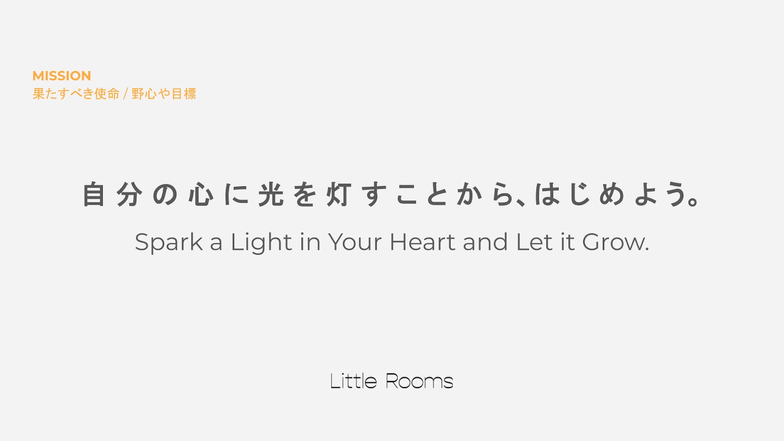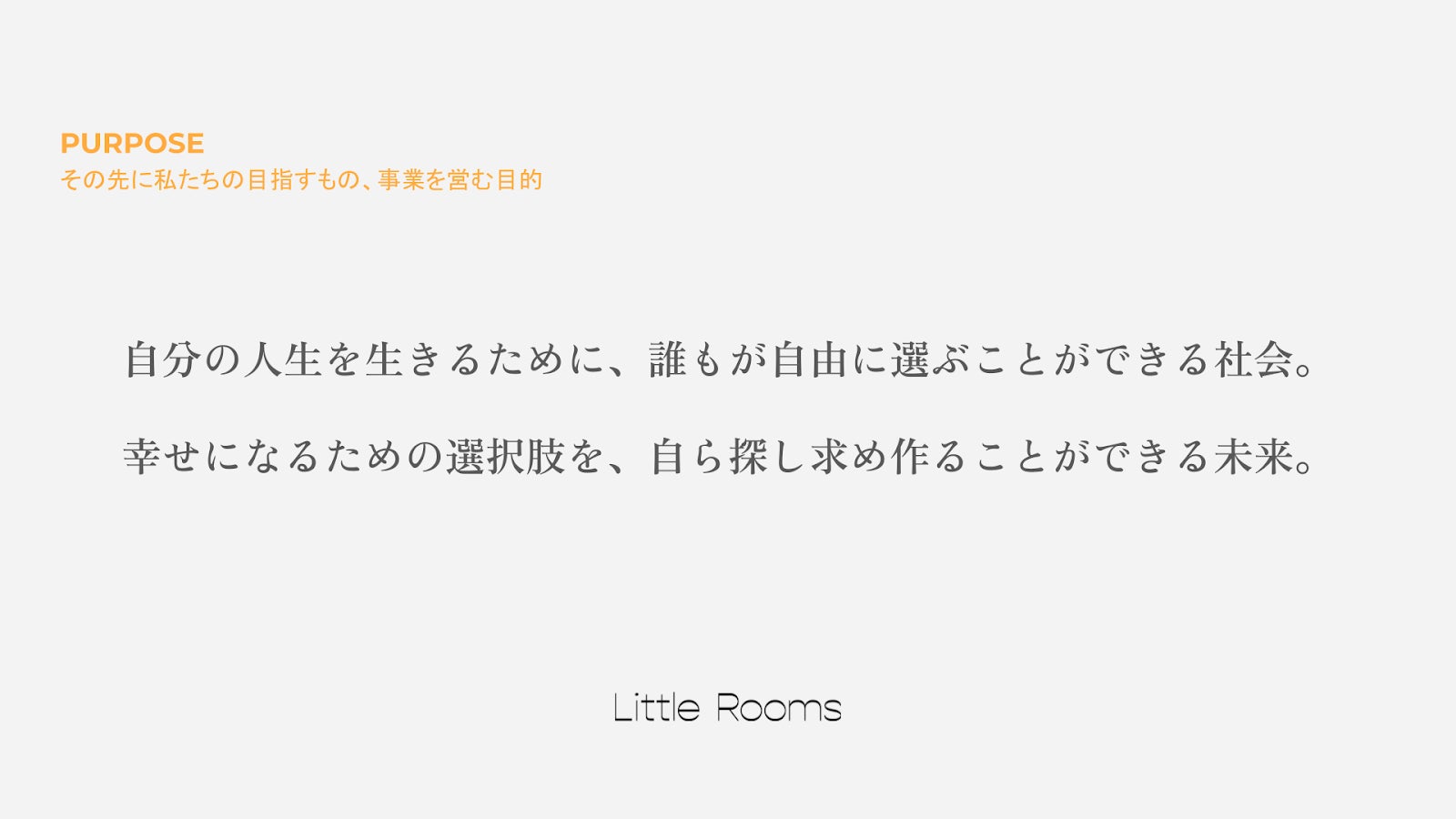 私たちが運営するサービスの名称でもある「Little Rooms」には“心の余白”という意味が込められています。私たちが考える“幸せ”とは、外部に求めるものではなく、自分の内側にある小さな何かを見つけること。そして、何かと比較することなく、自分が納得できる人生の選択をすることだと考えています。新社名には、自分らしい日々を少しずつ整えるために必要な余白を大切にしながら、納得のいく選択肢を生み出し選び取れる場所でありたいという願いが込められています。
