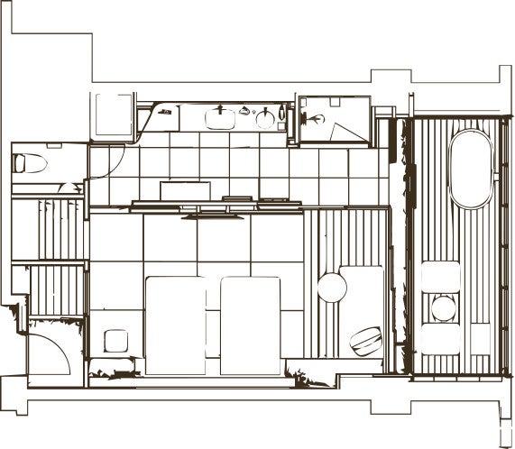 外界との一体感、どこからでも景色が楽しめるよう設計した露天風呂付客室は眺望を生かす透明ガラス張の手摺で景観を損なわず、特別注文して焼き上げた信楽焼きの湯舟でゆったりと時間を過ごしていただけます。