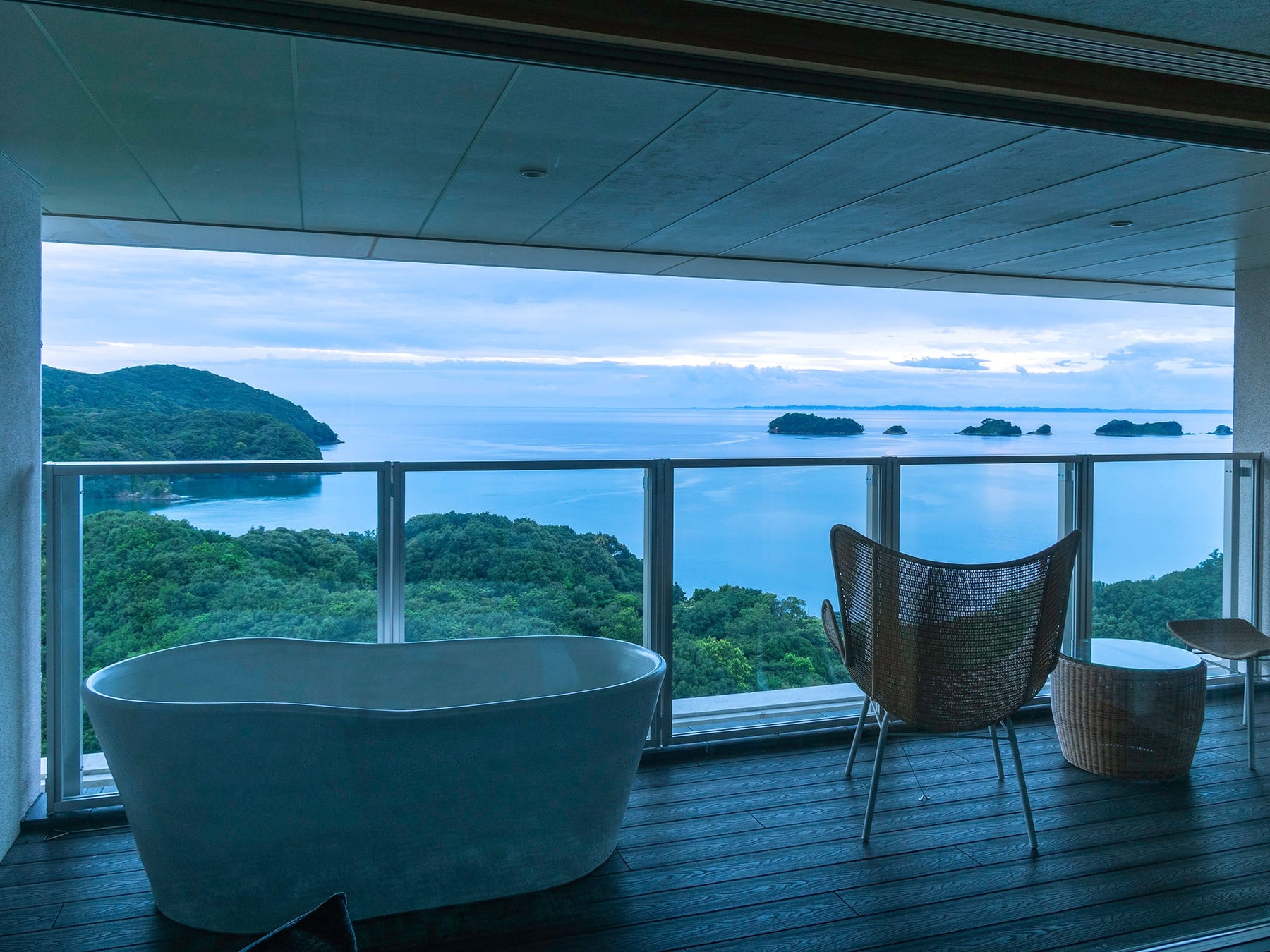 穏やかな海と島々が織りなす美しい風景が目に飛び込む、伊勢の自然に宿る空気を肌で感じ、湯に浸る。