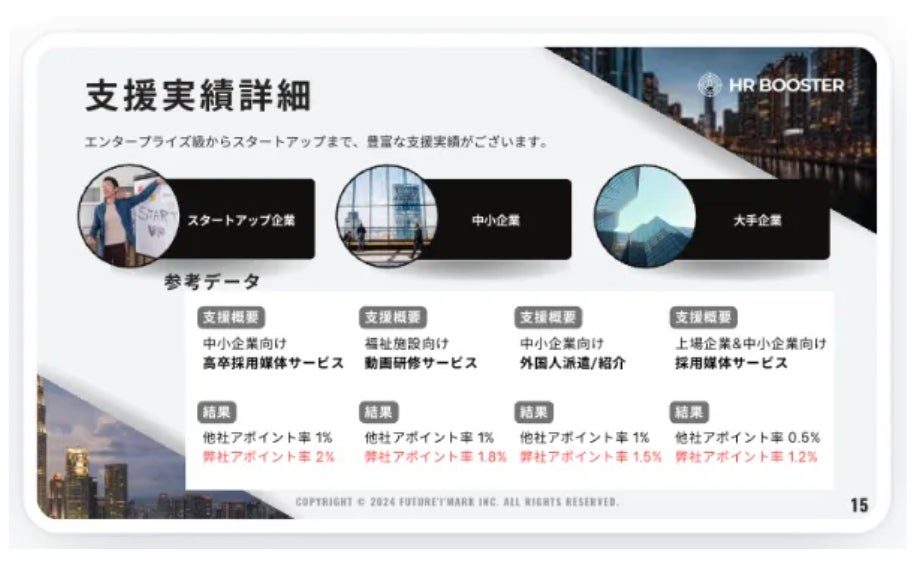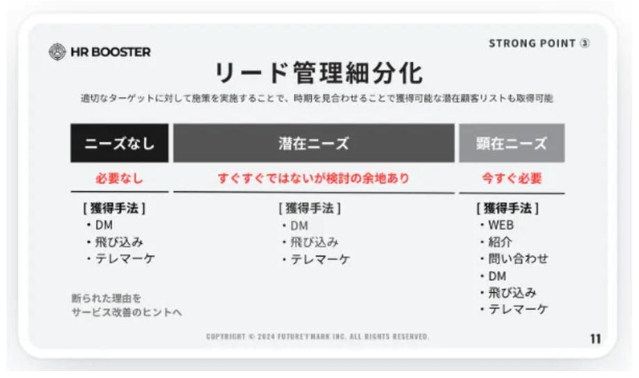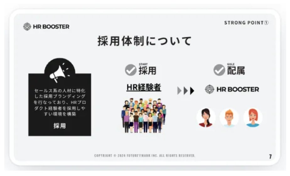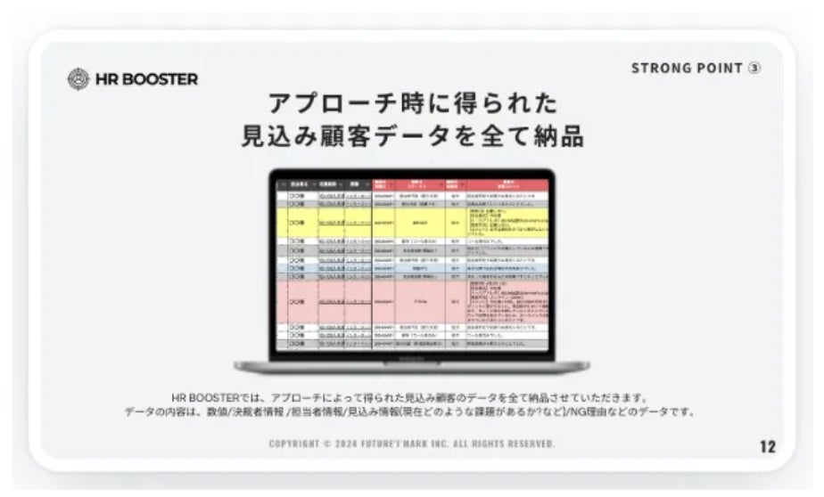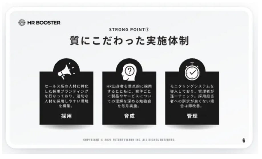 Future'I'Mark株式会社(本社:京都府京都市南区、代表取締役:脇田龍太郎、以下FIM)は、HR領域に特化した、成果報酬型のアポイント獲得サービス『HR BOOSTER(エイチアールブースター)』のサービス提供を開始します。この新サービスは、HR領域における営業人材のリソース不足の解消を、1名雇うよりも低いリスク・低いコストで実現します。公式サイトは下記のボタンからご確認いただけます。