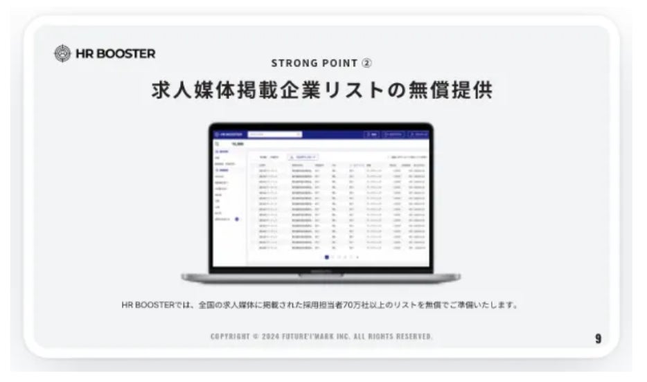 全国の求人サイトに掲載された70万件以上の人事/採用担当者のデータベースを活用し、HR領域製品・サービスのアポイントを効率よく獲得できるサービスです。