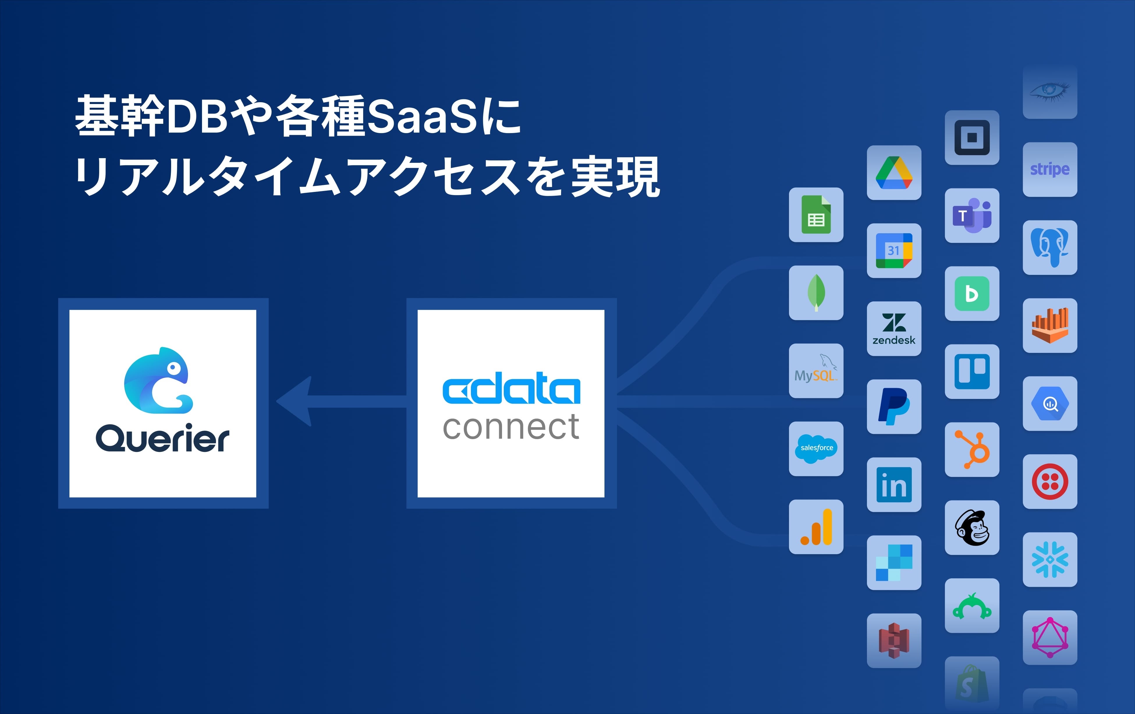 CData Connect は、DB のほかにもSalesforce、kintone などのSaaS やGoogle BigQuery、Snowflake などのクラウドデータストアのAPI を抽象化し、扱いやすい標準化されたかたちでクエリアから扱うことが可能になります。