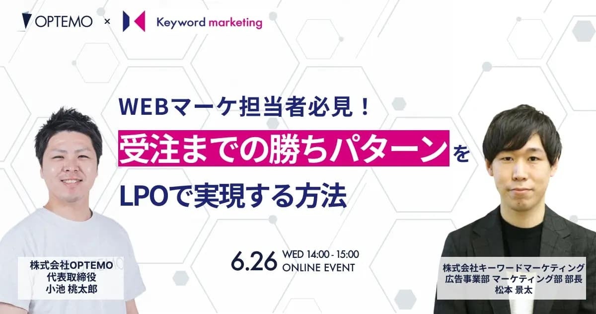 株式会社OPTEMO(本社:東京都千代田区、代表取締役:小池桃太郎、以下OPTEMO)は、株式会社ベクトル(本社:東京都港区、代表取締役会長兼社長:西江 肇司、東証プライム:6058)の子会社である株式会社キーワードマーケティング(本社:東京都港区、代表取締役会長:滝井 秀典)と共同で、『受注までの勝ちパターンをLPOで実現する方法 新規リード獲得のためのWeb広告戦略&サイト上で商談できる“OPTEMO”も紹介』と題したオンラインセミナーを6月26日(水)に開催いたします。