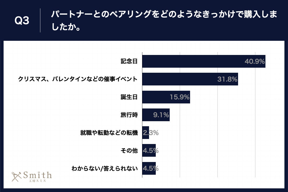 Q1で「持っている」と回答した方に、「Q3.パートナーとのペアリングをどのようなきっかけで購入しましたか。」(n=44)と質問したところ、「記念日」が40.9%、「クリスマス、バレンタインなどの催事イベント」が31.8%、「誕生日」が15.9%という回答となりました。