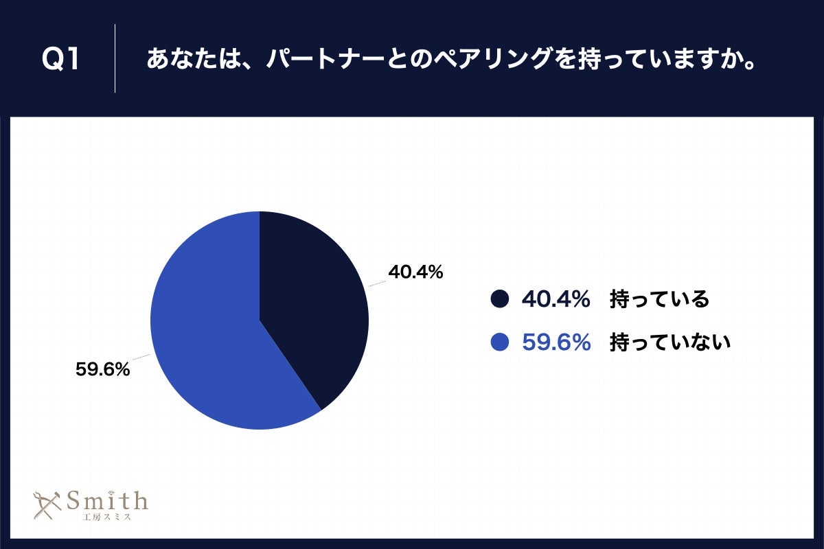 「Q1.あなたは、パートナーとのペアリングを持っていますか。」(n=109)と質問したところ、「持っている」が40.4%、「持っていない」が59.6%という回答となりました。