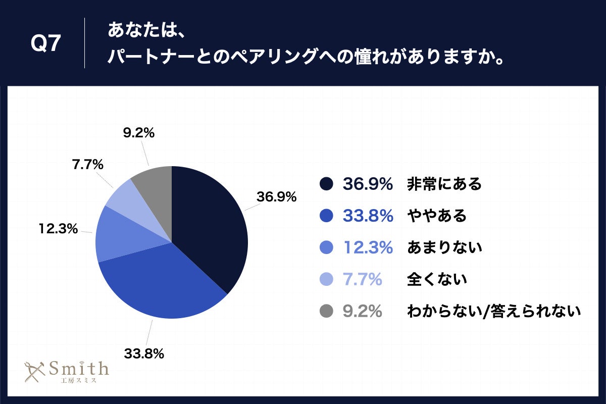 Q1で「持っていない」と回答した方に、「Q7.あなたは、パートナーとのペアリングへの憧れがありますか。」(n=65)と質問したところ、「非常にある」が36.9%、「ややある」が33.8%という回答となりました。