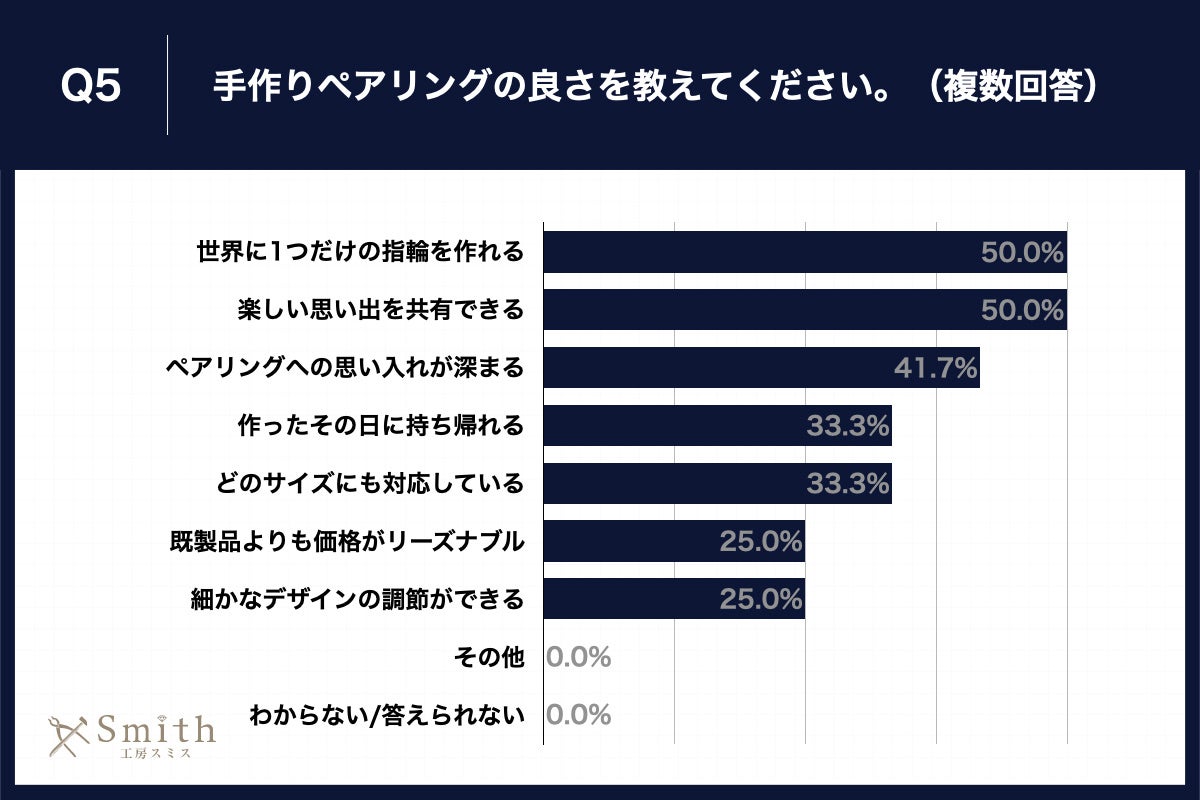 Q4で「手作り」と回答した方に、「Q5.手作りペアリングの良さを教えてください。(複数回答)」(n=12)と質問したところ、「世界に1つだけの指輪を作れる」が50.0%、「楽しい思い出を共有できる」が50.0%、「ペアリングへの思い入れが深まる」が41.7%という回答となりました。