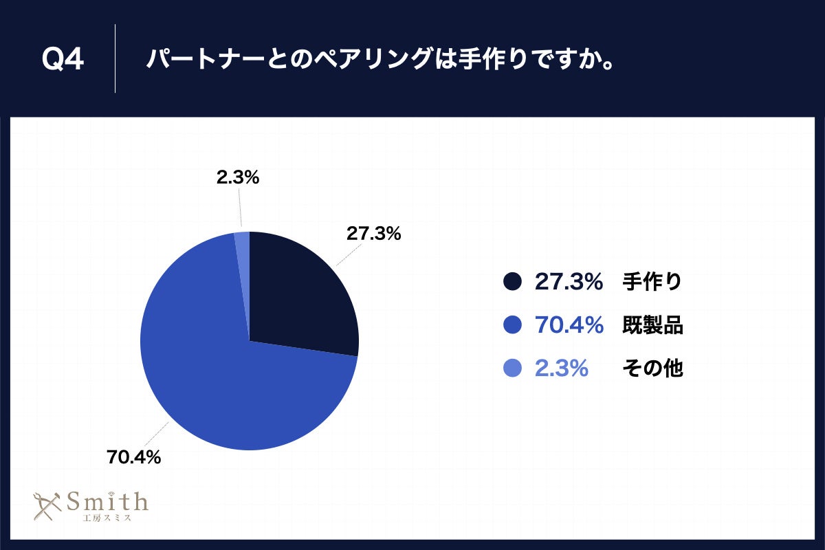 Q1で「持っている」と回答した方に、「Q4.パートナーとのペアリングは手作りですか。」(n=44)と質問したところ、「手作り」が27.3%、「既製品」が70.4%という回答となりました。