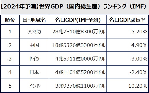 今年発表された2024年の世界GDPランキング(名目、IMF予測)では、かつて世界第2位の経済大国であった日本は中国に抜かれ、そして2023年にはドイツにも抜かれて後退しています。一方、中国は不動産不況やデフレに直面しているにもかかわらず2位を維持しています。