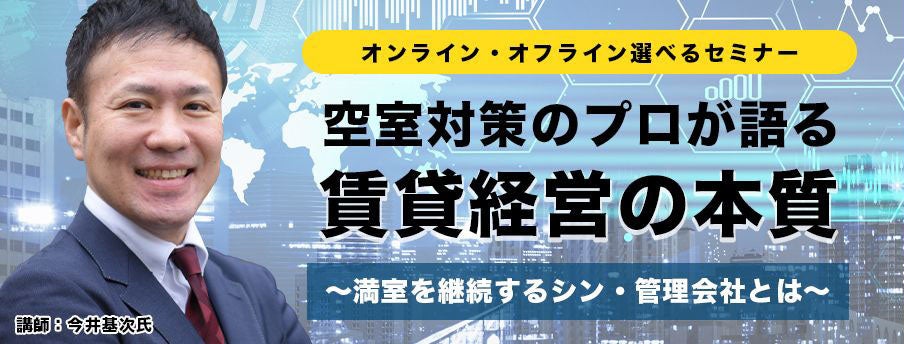 そこで今回のセミナーでは、不動産管理会社への業務コンサルティングを200社以上携わられ、かつ自らも不動産オーナーでいらっしゃる今井基次氏をお迎えし、不動産経営の本質や空室対策の考え方についてをお話しいただきます!