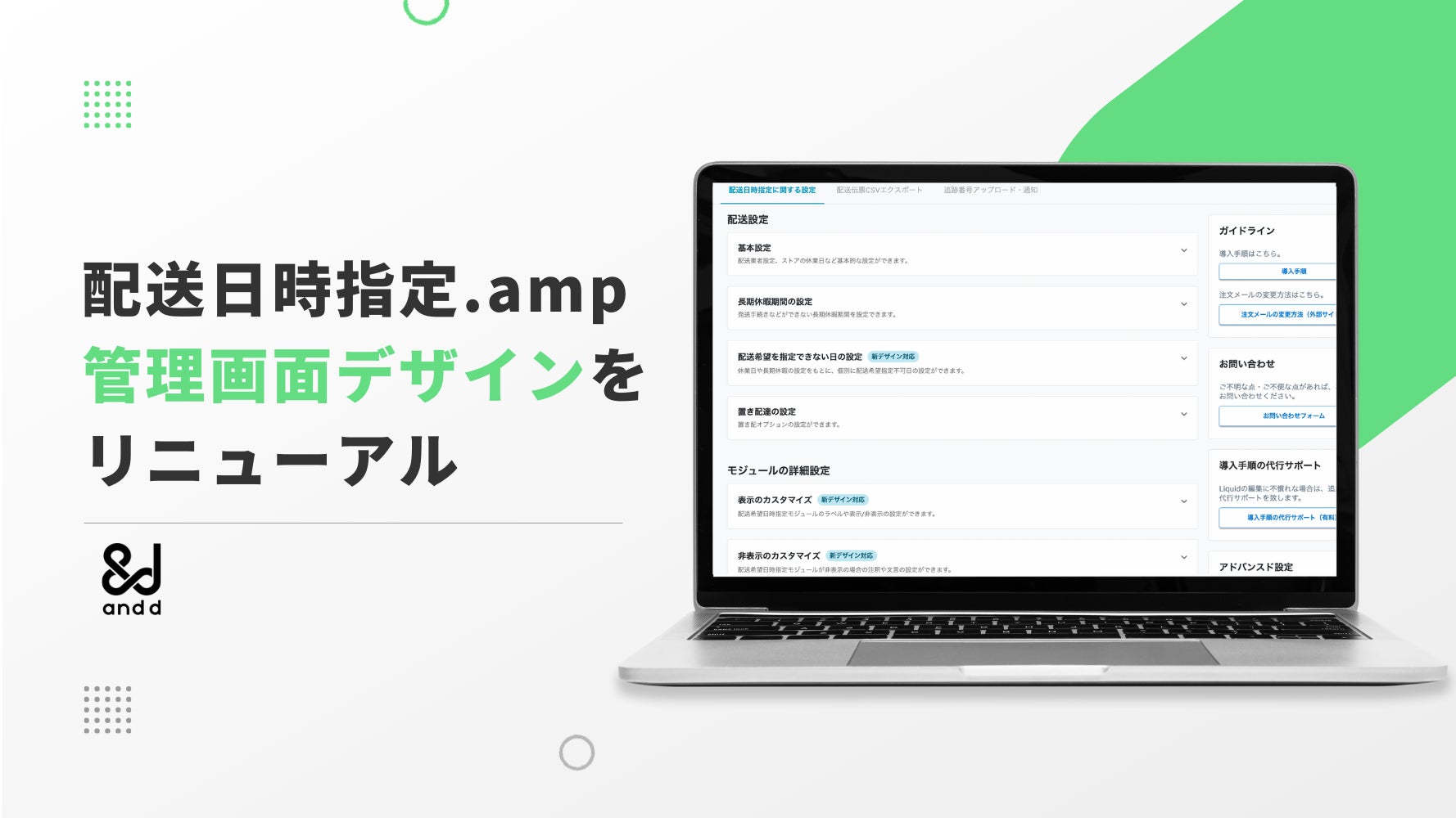 「配送日時指定.amp」は2019年4月から提供を開始し、現在では、配送日時指定・出荷伝票CSV作成アプリとしては人気のあるShopifyアプリとして多くのお客様にご利用いただいております。今後もより多くのストア様にご利用いただけるよう、従来の管理画面デザインでは分かりづらかった操作性などを解消し、より直感的で快適なユーザーエクスペリエンスを提供することを目的としてリニューアルを行いました。