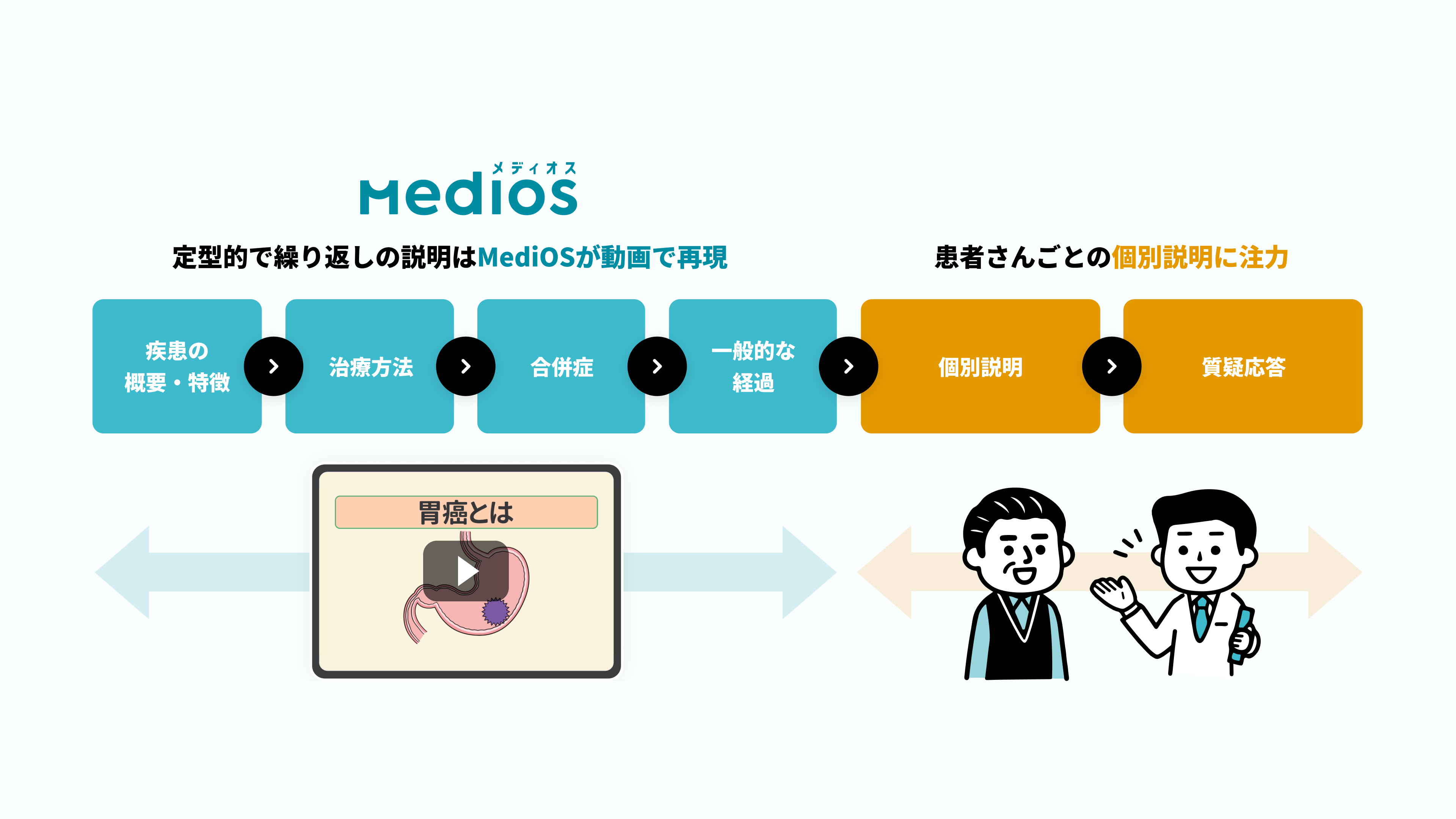 MediOSとは定型的な説明内容を分かりやすいアニメーション動画で提供するサービスです。MediOSを用いて、繰り返しの定型的な説明を動画で再現しあらかじめ患者さんに見てもらうことで、医師は限られた診察時間を患者さんごとの個別説明に充てることができます。医師は患者さんとの対話や個別性に即した説明、意思決定の支援などに注力することができ、業務効率のみならず患者さんの満足度や治療に対する納得度も向上することが期待できます。
