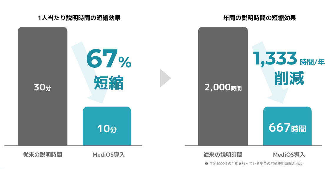 弊社では消化器内科のコンテンツに先立って麻酔科・眼科・泌尿器科のコンテンツをリリースしております。年間4,000件の手術を行っているある病院では、MediOSを導入したことにより、患者さん1人当たりの麻酔科の説明時間を30分から10分に短縮することができました。これは年間に換算すると1333時間もの説明時間削減に相当します。(*4)