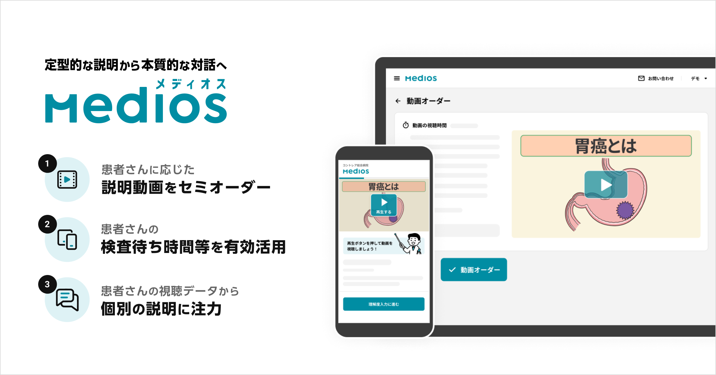 医療現場の業務効率化を図るだけではなく、患者さんがあらかじめ自身の疾患や治療方針について知識を得たうえで、医師との対面の診察に臨むことにより、より本質的な『対話』に注力できることがMediOS導入の最大のメリットです。