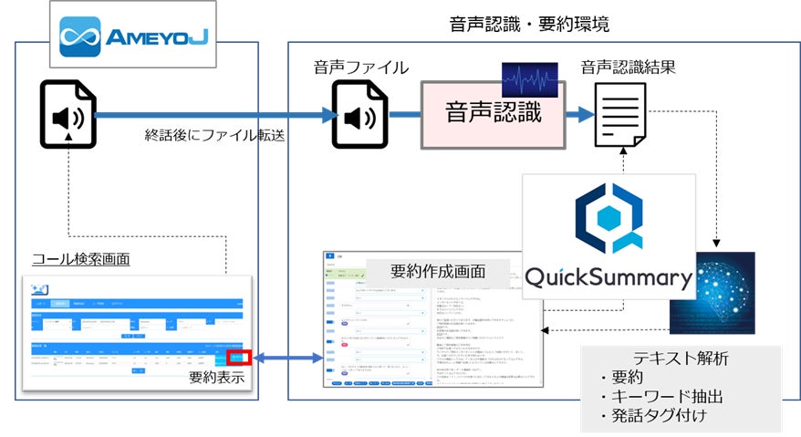 更に、本取り組みでは、エーアイスクエアが提供する音声認識エンジンが搭載された中間サーバー上で「QuickSummary2.0」を連携し、APIを介して「AmeyoJ」とシームレスな連携を構築しています。