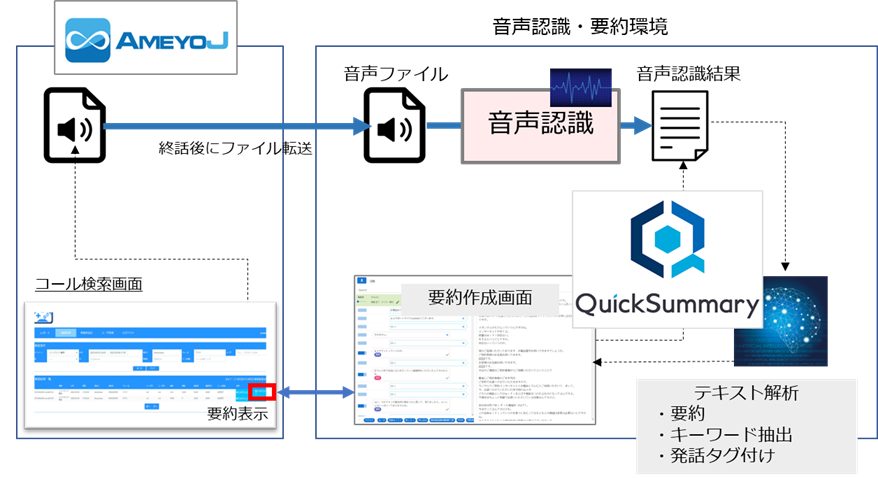 「AmeyoJ」で取得した音声を終話後にエーアイスクエアの音声認識・要約環境に転送してテキスト化、音声認識結果を「QuickSummary2.0」で要約表示します。