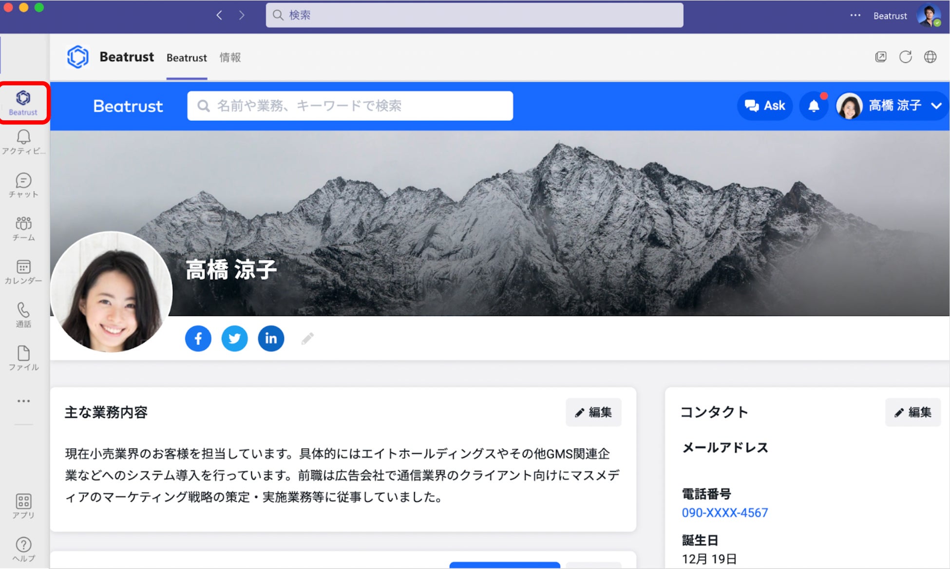 従来はBeatrustを参照する場合にブラウザへの切り替えが必要でしたが、ご利用企業のIT部門で設定いただくことにより、Teamsアプリ上でBeatrustをご利用いただくことが可能です。これにより、画面を切り替えることなくBeatrust内で検索やプロフィール閲覧ができ、日々の業務の中でより簡単にお互いのことを知ることができます。