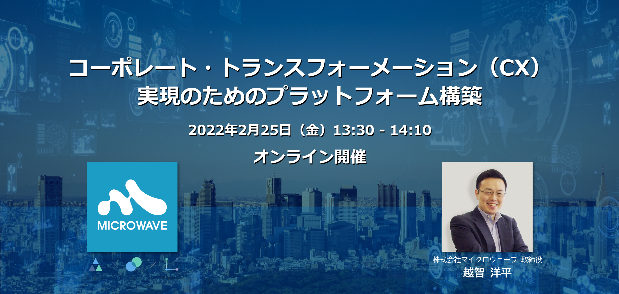 企業のデジタル戦略・DXの総合支援を手掛ける株式会社マイクロウェーブ(本社:東京都渋谷区、代表取締役:加藤孝光)は、「コーポレート・トランスフォーメーション(CX)実現のためのプラットフォーム構築」と題した無料オンラインセミナーを2022年2月25日(金)に開催いたします。