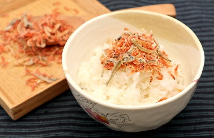 海の風味と豊かな味わい、国産原料にこだわった、海老といわしのちりめん。ごはんにふりかけて、パスタ、お好み焼き、冷奴、卵焼きに。山年園がおすすめする【国産】海老ちりめんを販売しました。