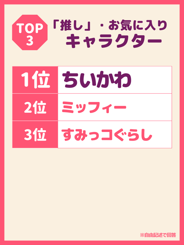 今回、特徴的だった「キャラクター」部門で「ちいかわ」、「ミッフィー」、「すみっこぐらし」があがっている。「ちいかわ」はアニメ・漫画でもランキングでも複数回答が寄せられており根強い人気が伺える。