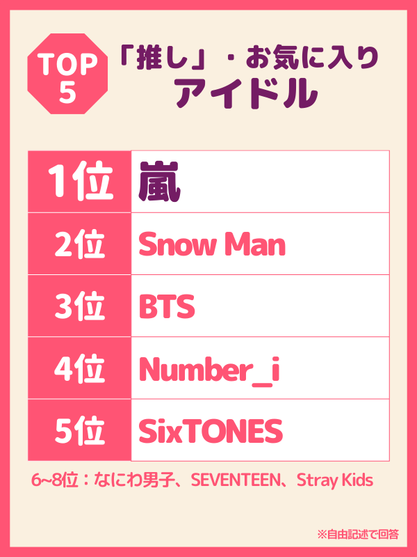 「アイドル」部門では、「嵐」「Snow Man」「Number i」「SixTONES」「なにわ男子」など、旧ジャニーズ事務所のタレントたちの人気が目立った結果となった。特に1位の「嵐」は、4月にメンバー5人が新会社を設立したことも大きな話題となり、前回1位の「BTS」を抜いてトップに立った。とはいえ、「BTS」「SEVENTEEN」「Stray Kids」と韓国アイドルも引き続き根強い人気となっている。
