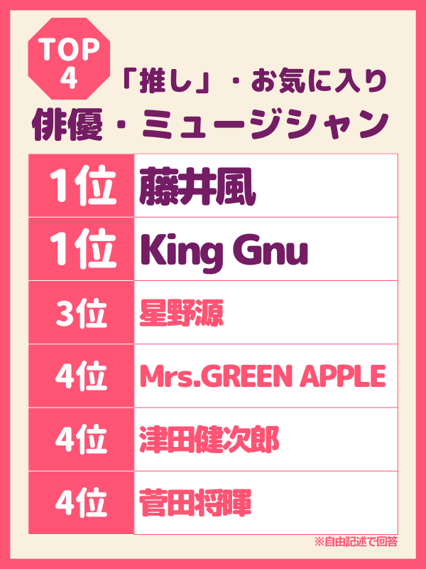 「俳優・ミュージシャン」では特にミュージシャンの「藤井⾵」を推す⼈が多く、YouTubeや⾳声メディアで彼の⾳楽を聴いている⼈も多い。またアニメやドラマ、映画の主題歌を数多く⼿がける「Mrs. GREEN APPLE」も、この世代からの⽀持を得ている。
