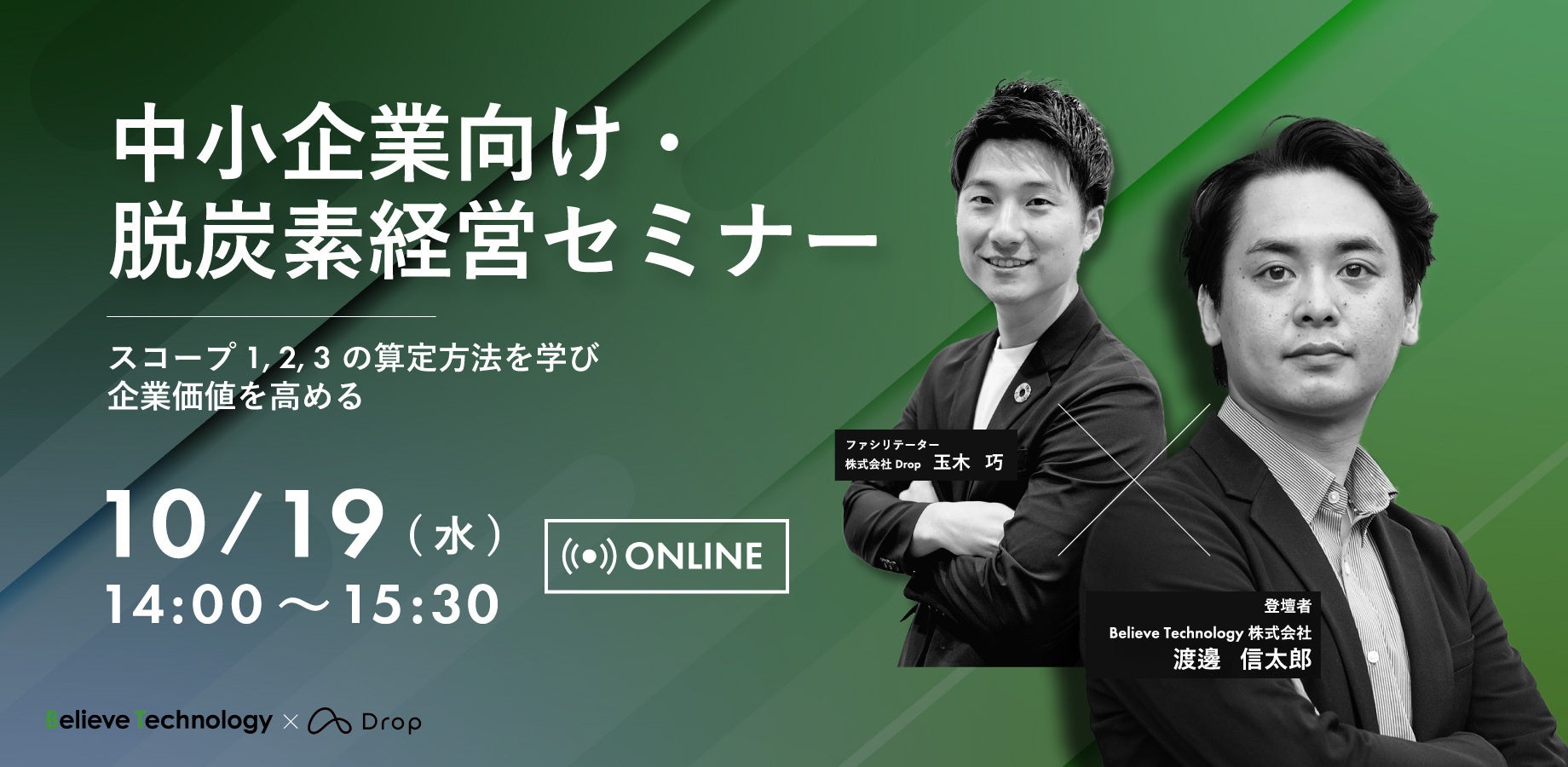法人向けの SDGs 研修・コンサルティングを行う株式会社 Drop(本社:大阪市北区、代表取締役 米田 真介)は、大企業から中小企業までスコープ1.2.3の算定を支援しているBelieve Technology株式会社(本社:神奈川県川崎市中原) 代表取締役の渡邊 信太郎氏を講師に迎えて、2022年10月19日(水)に中小企業向け・脱炭素経営オンラインセミナー(無料)を共同開催します。