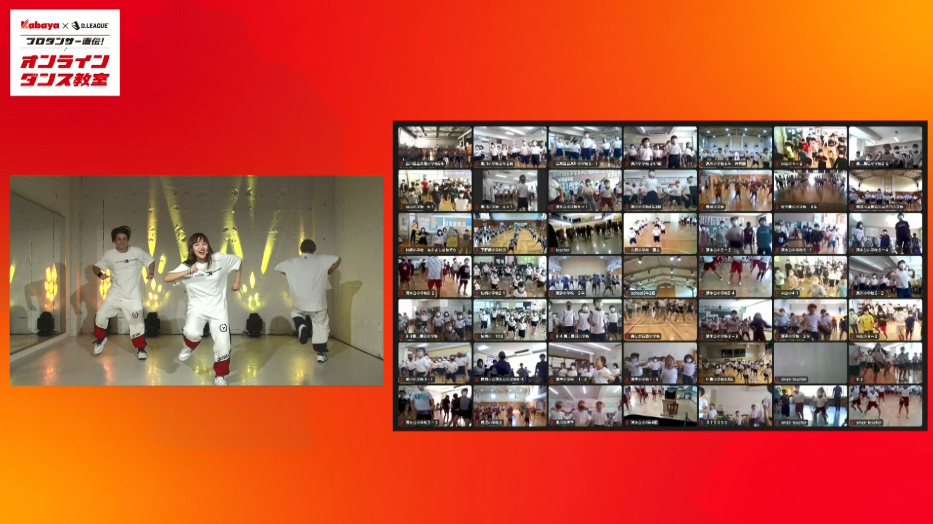 株式会社Dリーグ(本社:東京都港区、代表取締役CEO:平野岳史、代表取締役COO:神田勘太朗、以下「Dリーグ」 )は、ダンスを通じた社会貢献活動の一環として、D.LEAGUEのスポンサー企業であるカバヤ食品株式会社(本社:岡山市北区、社長:野津 基弘、以下「カバヤ食品」 )と、一都三県(東京都・神奈川県・埼玉県・千葉県)の34校の小学校に通う約3,800名の小学生を対象に「カバヤ食品×D.LEAGUE プロダンサー直伝!オンラインダンス教室」を9月28日(水)に開催いたしました。