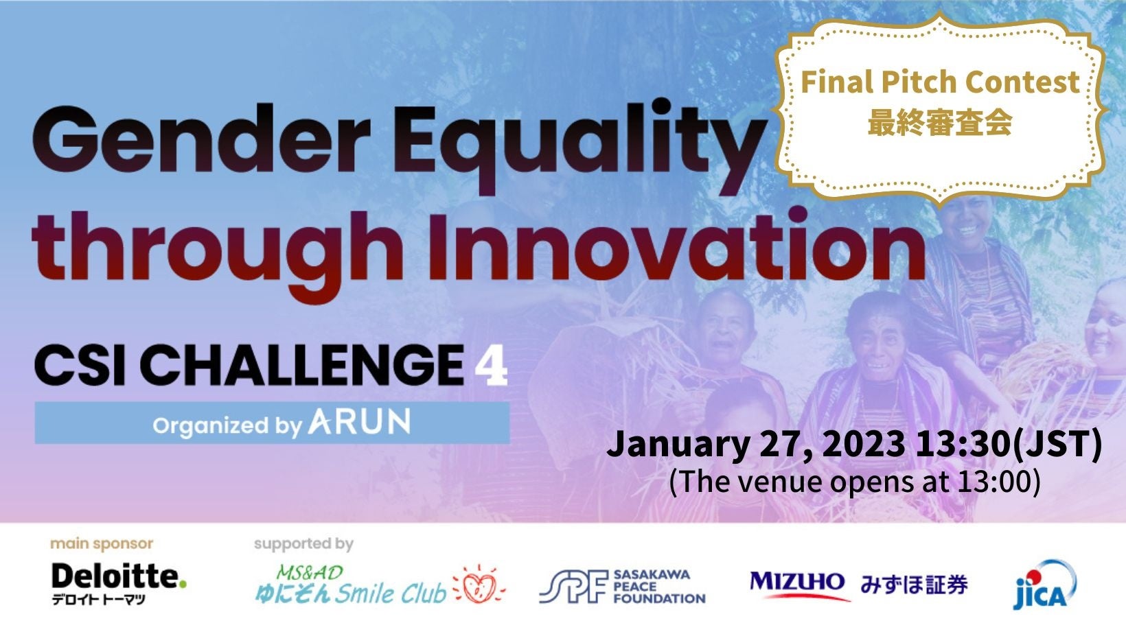 特定非営利活動法人ARUN Seedは、世界の様々な地域で社会課題に取り組む起業家を募るビジネスコンペティション、「CSIチャレンジ」を2016年より開催しています。今回は、「ジェンダー平等の実現」をテーマに開催、世界22ヵ国、72人の社会起業家から応募がありました。優勝企業を決める最終審査会を、2023年1月27日に開催します。