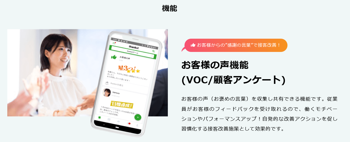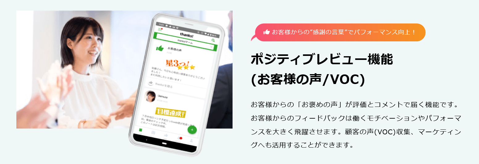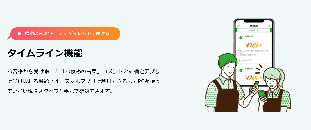 (「thanks!」を導入頂くと、店舗・スタッフへダイレクトに「お客様の声」を届けることができます。)