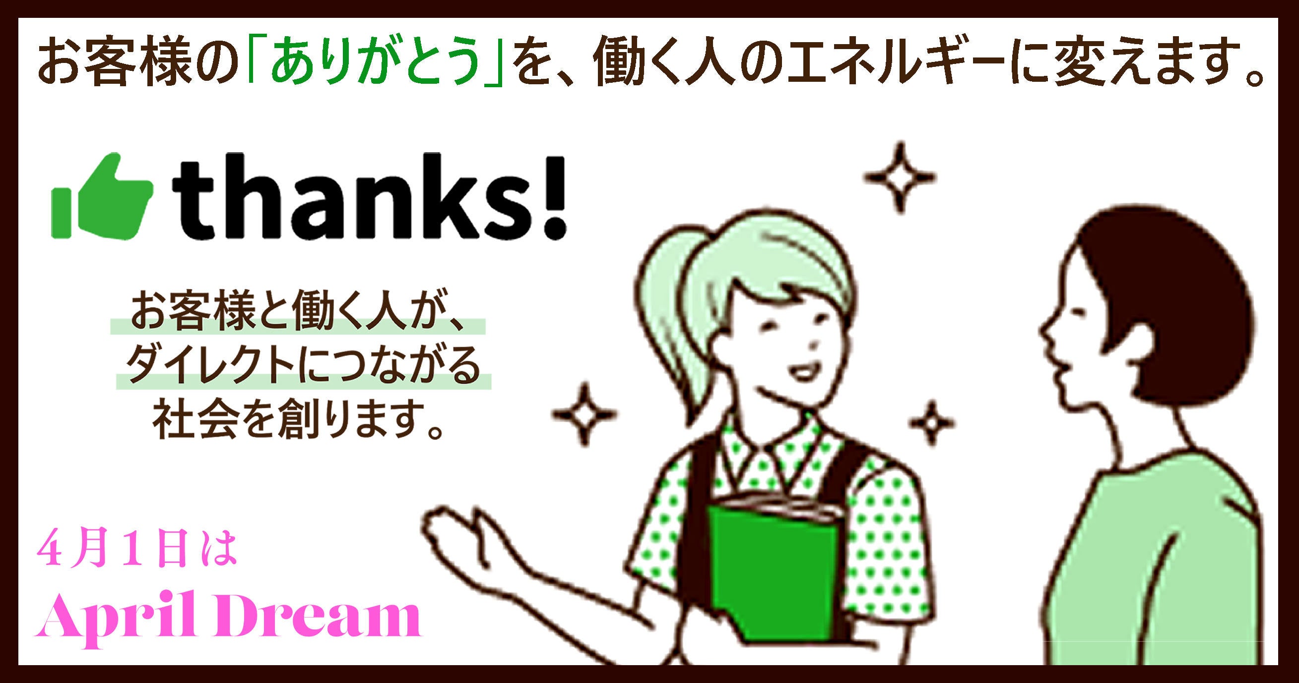 お客様の「ありがとう」を働く人のエネルギーに変え、お客様と働く人がダイレクトにつながる社会を創ります。