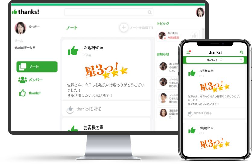 私たちは、「お客様の声」を接客改善にダイレクトに活かす クラウド型接客改善ツール「thanks!」を開発・運営しています。「thanks!」を導入頂くと、お客様の「ありがとう」を簡単に集めることができ、更に店舗・スタッフへダイレクトに届けることができます。