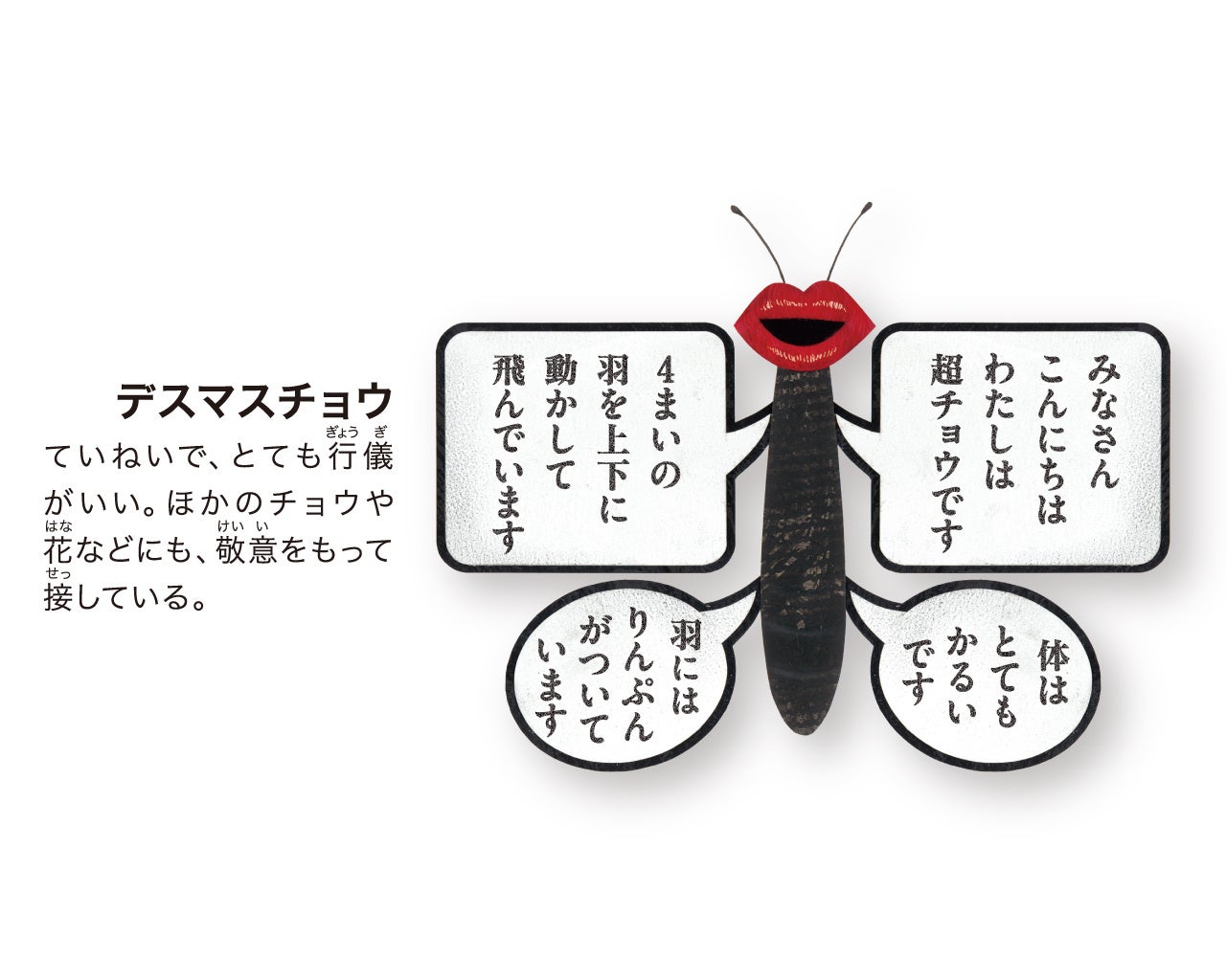 どの超チョウも、ビジュアルが魅力的なのはもちろん、思わずくすっとなるような超チョウの名前や生態系の説明文に、どんどん惹き込まれていくこと間違いなしです。