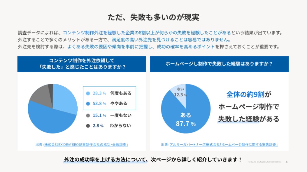 その結果、制作を外注する企業も増えていますが、外注を経験した企業の8割以上が何らかの失敗を経験しているという調査結果もあります。