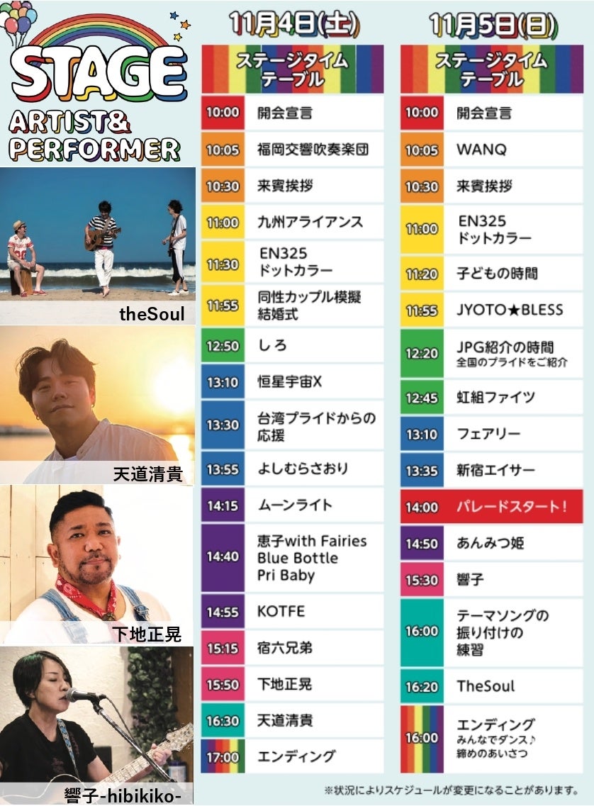 ステージでは、アーティストによるパフォーマンスや、有識者によるトークショーに加え、台湾プライドとの交流や、福岡交響吹奏楽団による演奏など幅広いジャンルのプログラムをお楽しみいただけます。