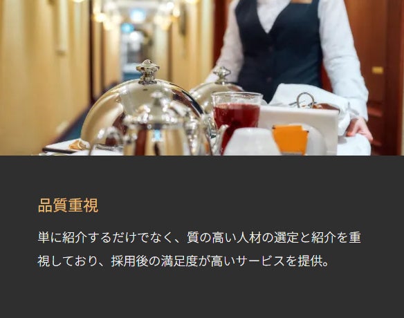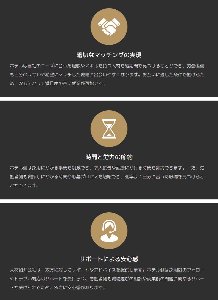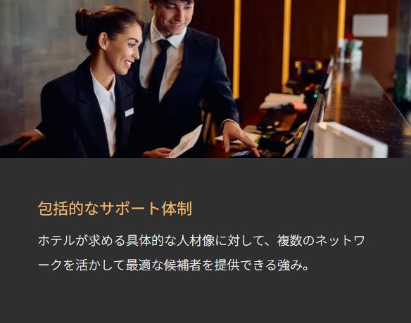 また、ホテル業界以外への転職支援も行っております。こちらも、労働者側にとっては、職探しにかかる時間や手間を大幅に短縮でき、効率的に希望に合った職場を見つけることができます。さらに、職場選びや就業後のサポートも提供するため、安心感を持ってキャリア形成に取り組めます。