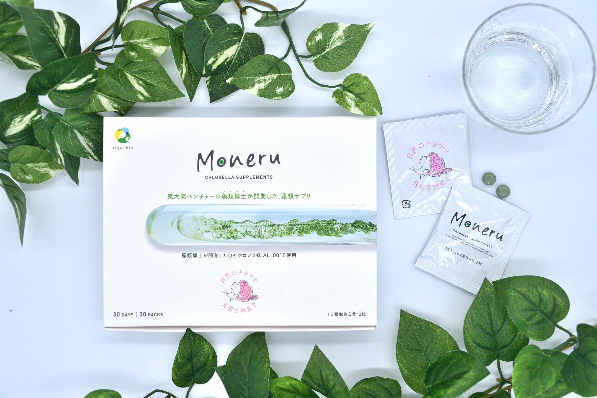 Moneruは、東京大学発ベンチャー アルガルバイオの藻類博士が「良質な休息」に着目して開発した『藻』サプリメントです。多種多様な藻類の中から、カラダの休息に特化した新たなクロレラ株「クロレラAL-0015株」を選抜して配合しました。米国にて開催の「テックトレードショーCES2023」でFood&AgTech部門の「Innovation Awards」を受賞しています。