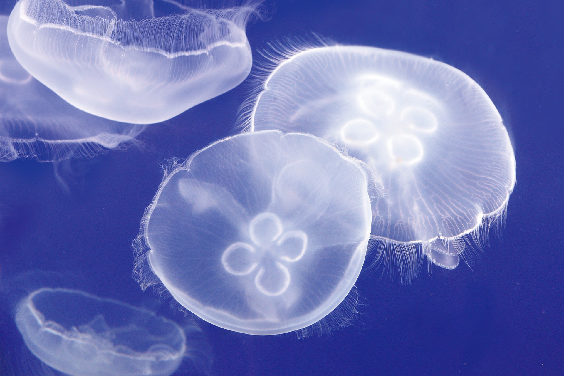 最初はウェルカムラウンジにて、ミズクラゲがお出迎え。私たちが普段目にするゆったりと浮遊する姿は、クラゲの生活史のほんの一部です。