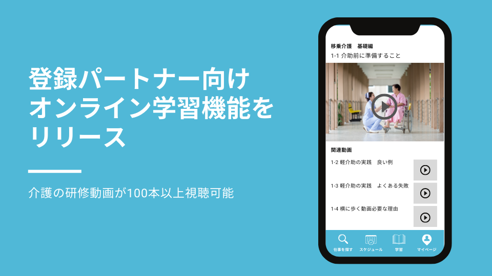 オンライン学習機能とは、イチロウの登録パートナー(介護士・看護師)が使用するアプリケーションから、いつでもどこでも介護動画を視聴できる機能です。