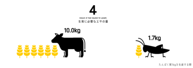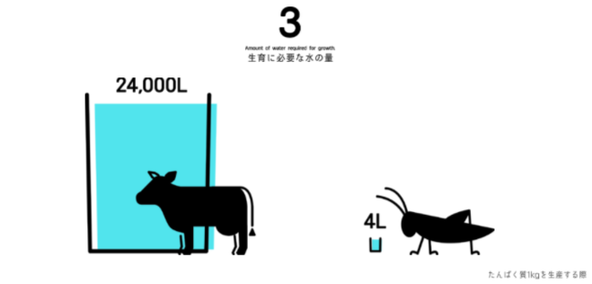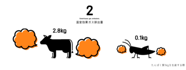 ホエイの原料である牛と比べ、タンパク質1kgを生産するのに排出する温室効果ガスは28分の1。また必要な水の量は約6000分の1、エサも約6分の1と最もサステナブルな動物性タンパク質であります。