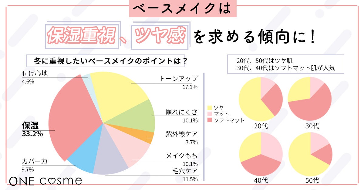「冬メイクでなりたいorメイクで仕上げたい肌質は?」という質問への回答は、年代によって異なる結果になりました。20代・50代はツヤを、30代・40代はソフトマットを重視する傾向があります。